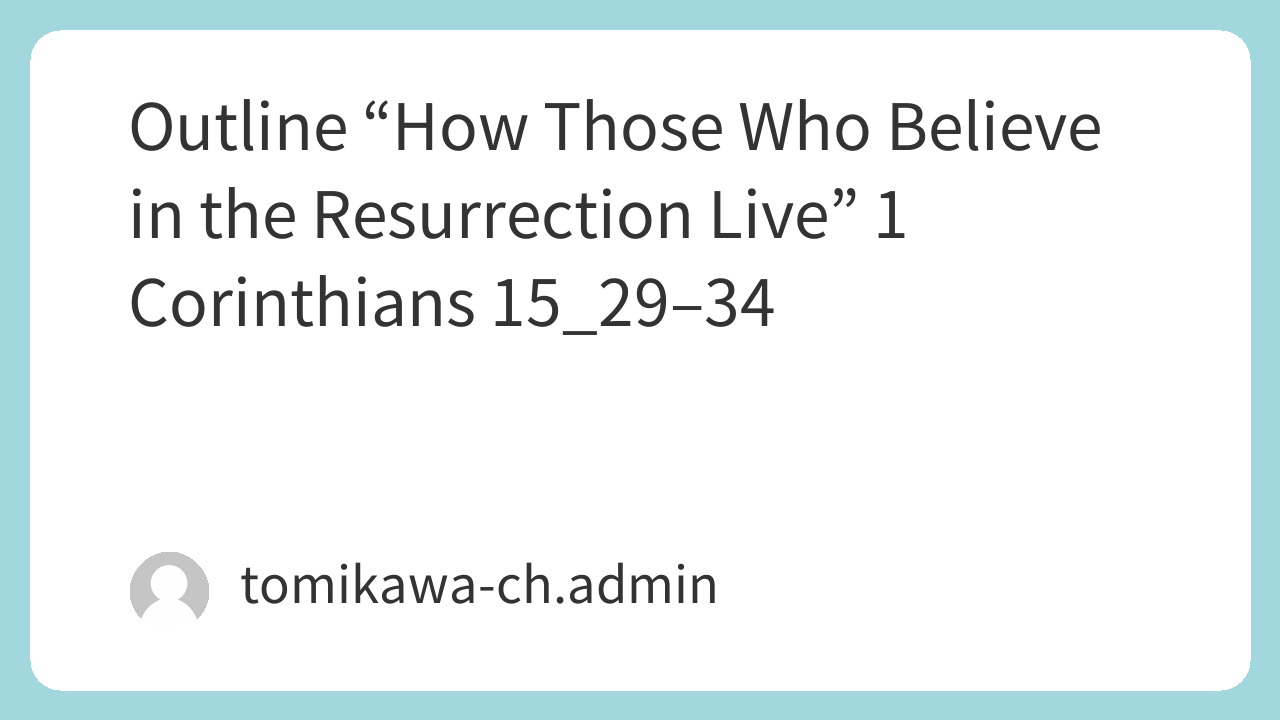 Outline “How Those Who Believe in the Resurrection Live” 1 Corinthians 15_29–34 レジメ 2026.02.08 Outline “How Those Who Believe in the Resurrection Live” 1 Corinthians 15_29–34ダウンロード