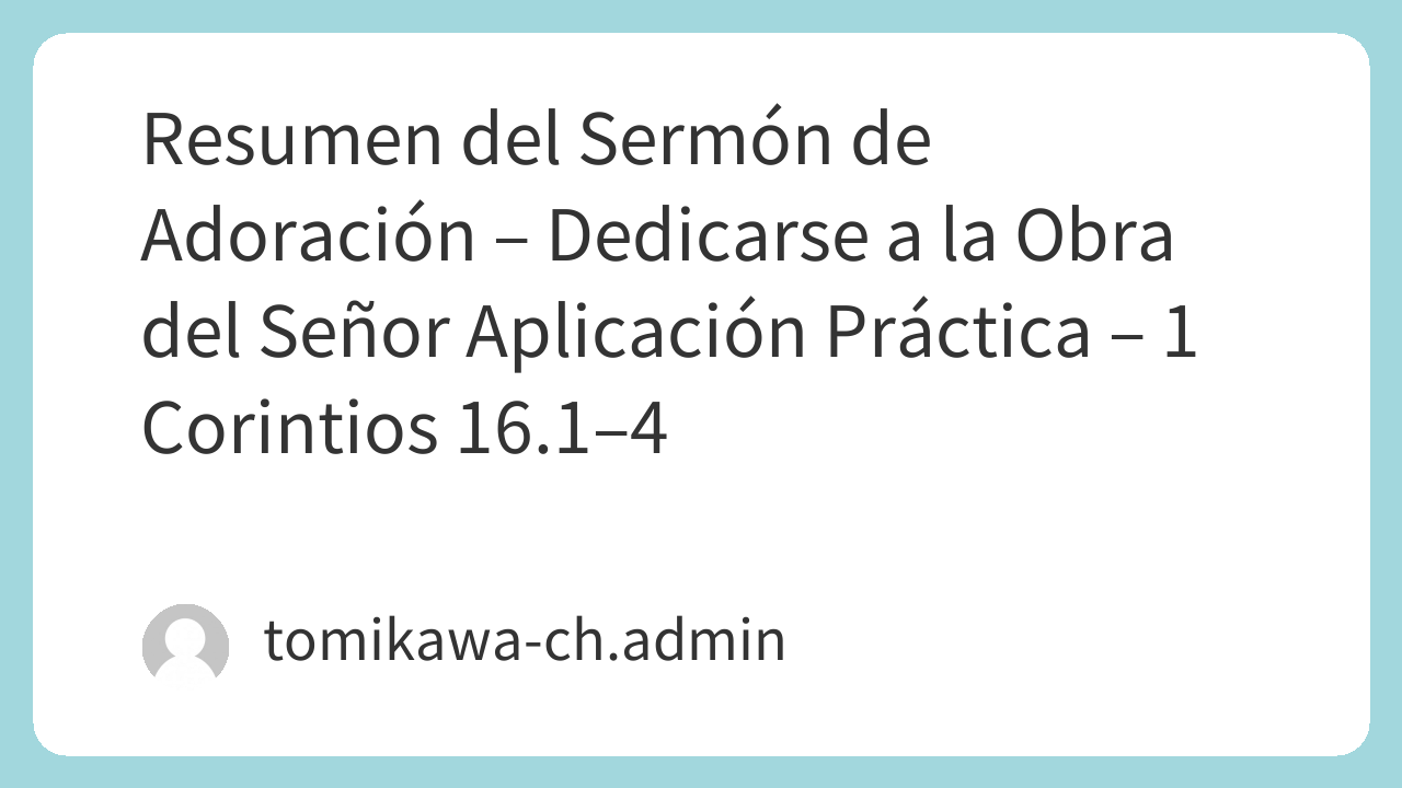 Resumen del Sermón de Adoración – Dedicarse a la Obra del Señor Aplicación Práctica – 1 Corintios 16.1–4 レジメ 2026.03.08 Dedicarse a la Obra del Señor Aplicación Práctica 1 Corintios 16.1–4ダウンロード
