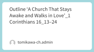 レジメ Outline ‘A Church That Stays Awake and Walks in Love’_1 Corinthians 16_13–24 Outline 'A Church That Stays Awake and Walks in Love'_1 Corinthians 16_13–24ダウンロード 2026.03.22 ホームレジメ礼拝・祈祷会説教文